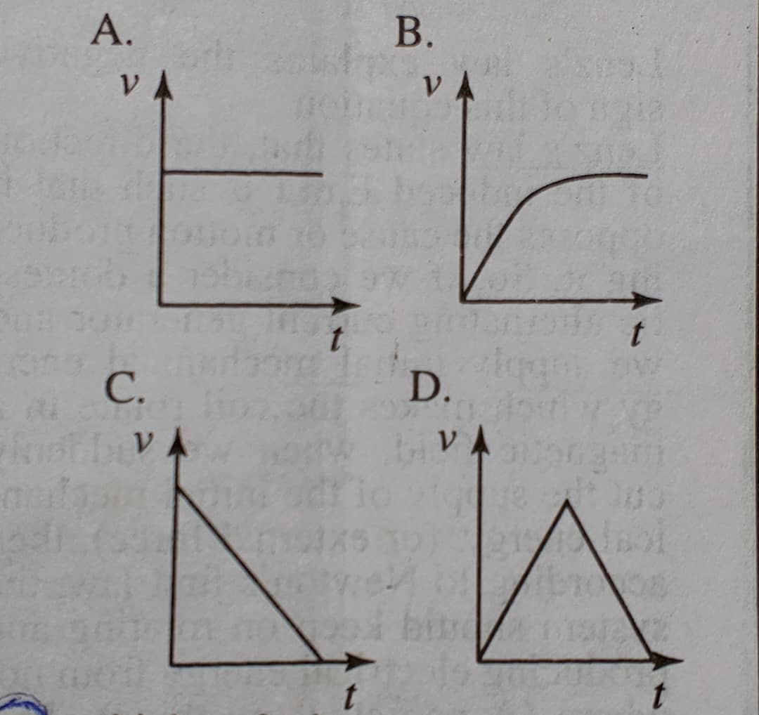 13. Which of the following velocity – time graph most suitable represent a solid ice puck pushed forward on a smooth horizontal surface?